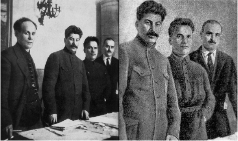 I must have asked that question at the time, but I don’t remember how I framed it, or how she answered. Now, relevant details are easy to find on the Internet — for instance, on a page at the Rare Historical Photos site, which notes that, after sending Trotsky into exile, Stalin ordered him “eliminated from all photos.” His censors also erased other rivals or potential rivals, as strikingly shown in a spread of four successive copies of the same Stalin photo. The original print, from 1926, has him standing with three contemporaries; in three subsequent versions each of them would be deleted, one at a time.