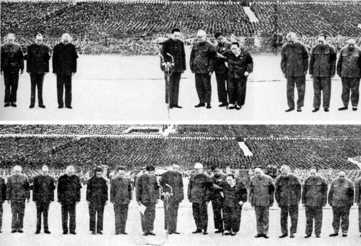 Only weeks earlier, hundreds of millions of Chinese and other readers around the world had seen photographs in the Chinese communist newspaper, the People’s Daily, and other official media showing all four sitting in the front row of mourners at Mao’s funeral. After they were arrested, Chinese publications continued to carry those photos — but with Jiang and her three allies, now labeled the “Gang of Four,” airbrushed out. The editing was anything but subtle: blurred smudges or blank spots appeared where they had been in the originals, while their names in the captions were blotted out by vertical rows of X’s.