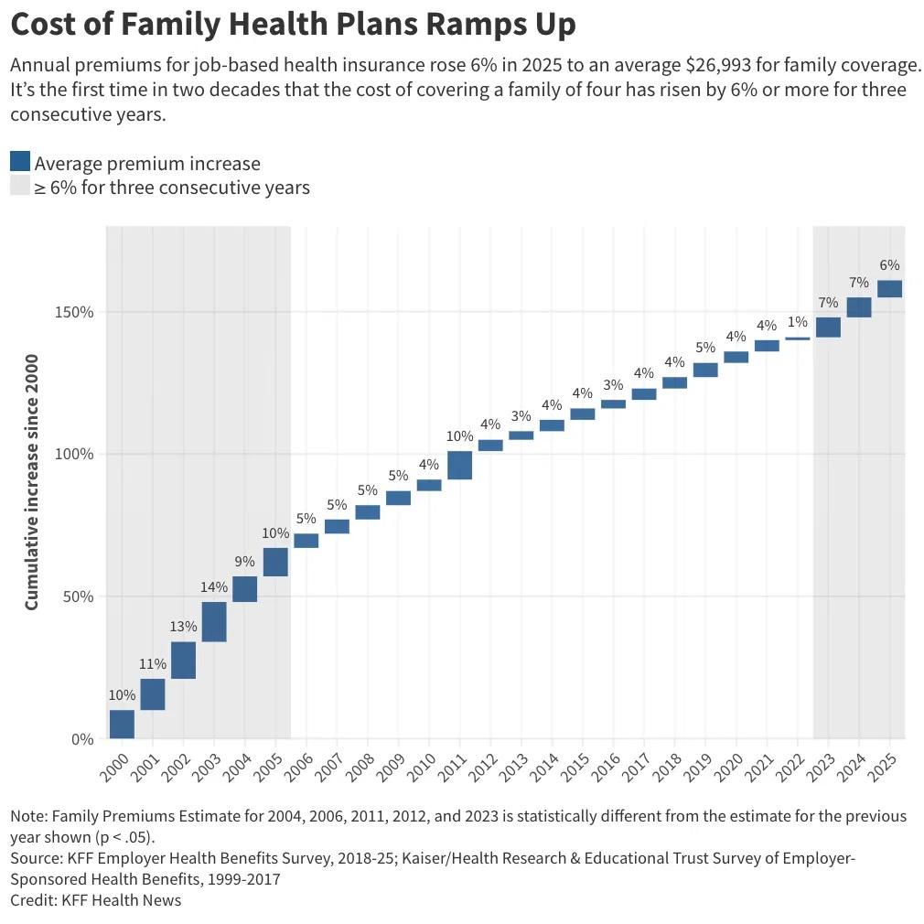 2025 marked the first time in two decades that the annual cost of covering a family of four rose by 6% or more for three consecutive years.